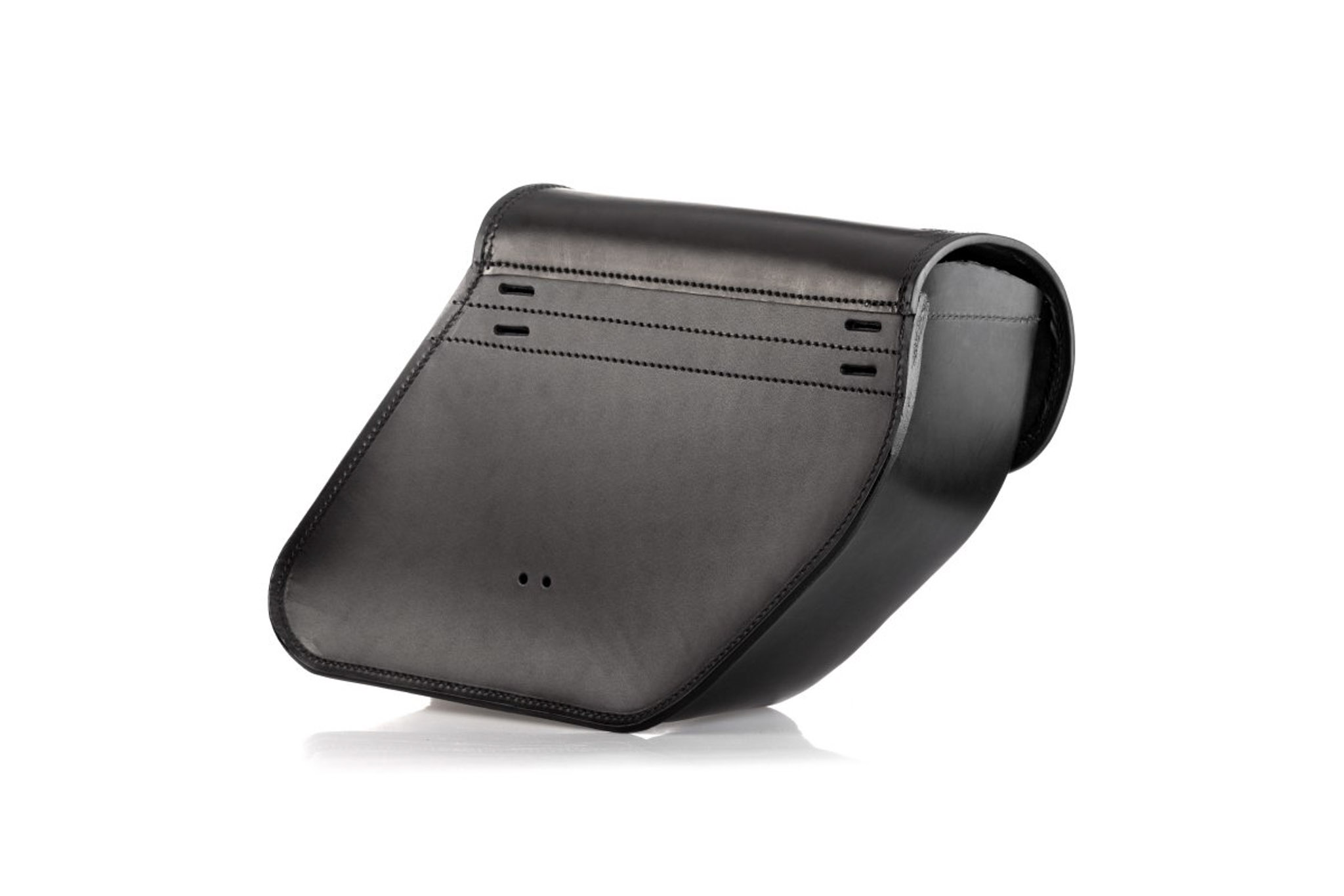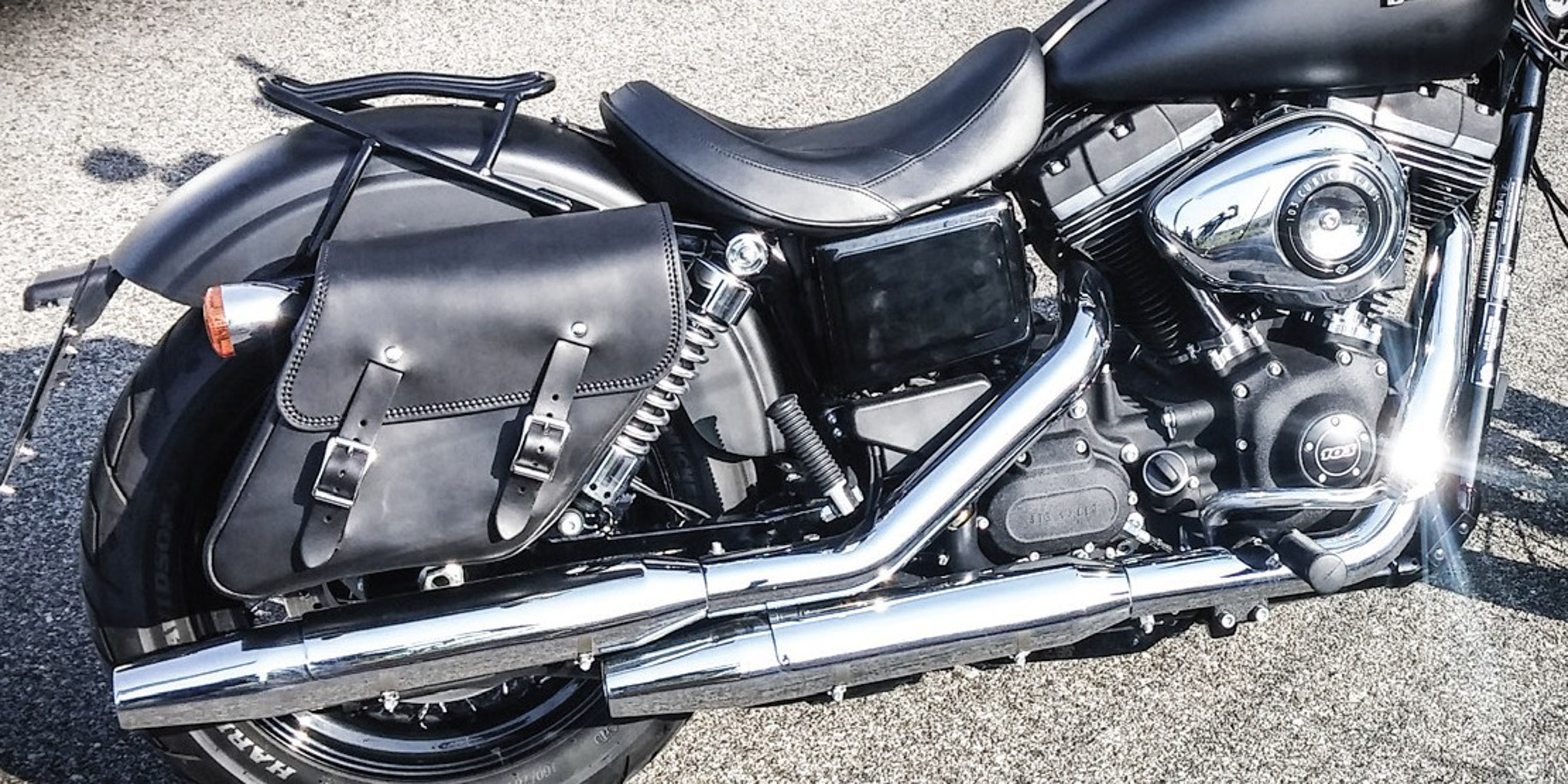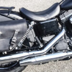 La borsa è studiata appositamente per essere fissata dietro all’ammortizzatore dei Dyna tramite delle cinghiette con fibbia.